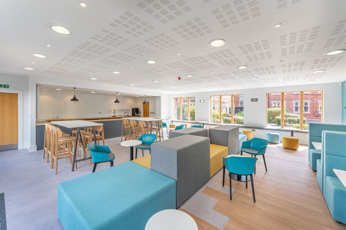 Ratcliffe’s new English Language Centre, built with a £2.5 million investment, became the first carbon-neutral building on campus. The facility houses nine classrooms and four atriums, where passive ventilation monitors CO₂ levels to maintain fresh air throughout. Its environmental credentials include a sedum roof alongside 40 solar panels, while air-source heat pumps recover excess heat to boost efficiency.